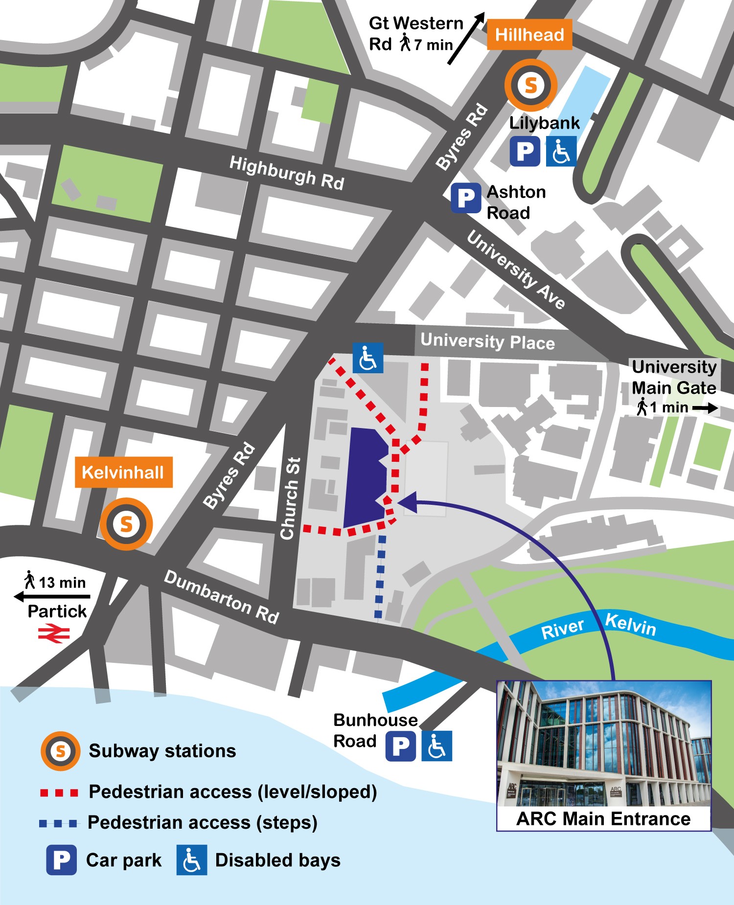 The venue is located approximately 2 km (1.3 miles) from the Scottish Event Campus, where ICC 2026 is held. From there, the workshop venue is accessible by car (taxi/Uber, ~10 min), public transit (bus, ~20 min), or on foot (~30 min).